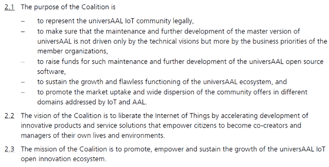 Following many years and iterations as academic led R&I projects [1], The universAAL IoT Coalition (uIC) is now being launched as a public facing, open and non-profit international association in Brussels in order to bridge the open source community of universAAL to the market.